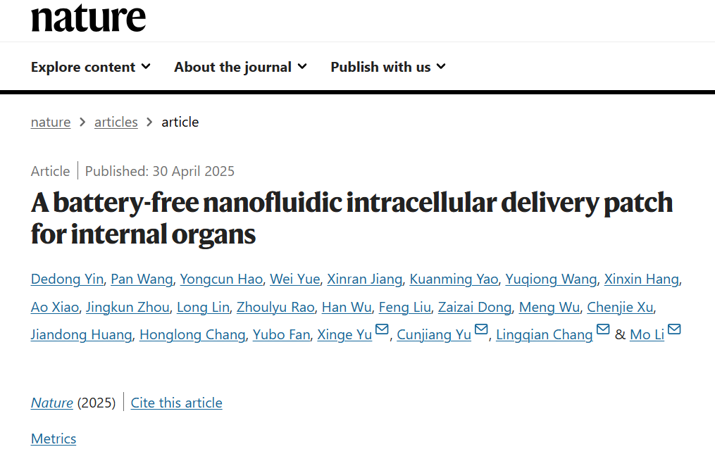2025-052025年4月30日(北京时间),国际著名学术期刊《自然》(Nature)杂志在其官方网站上刊登了题为“A battery-free nanofluidic intracellular delivery patch for internal organs”的学术论文。该论文由北京航空航天大学、北京大学第三医院、hg8868皇冠官方登录平台等 12 家单位携手完成。我校学院郝永存副研究员为论文共同第一作者。论文介绍了一种柔性可植入式电子贴片(NanoFLUID),它融...