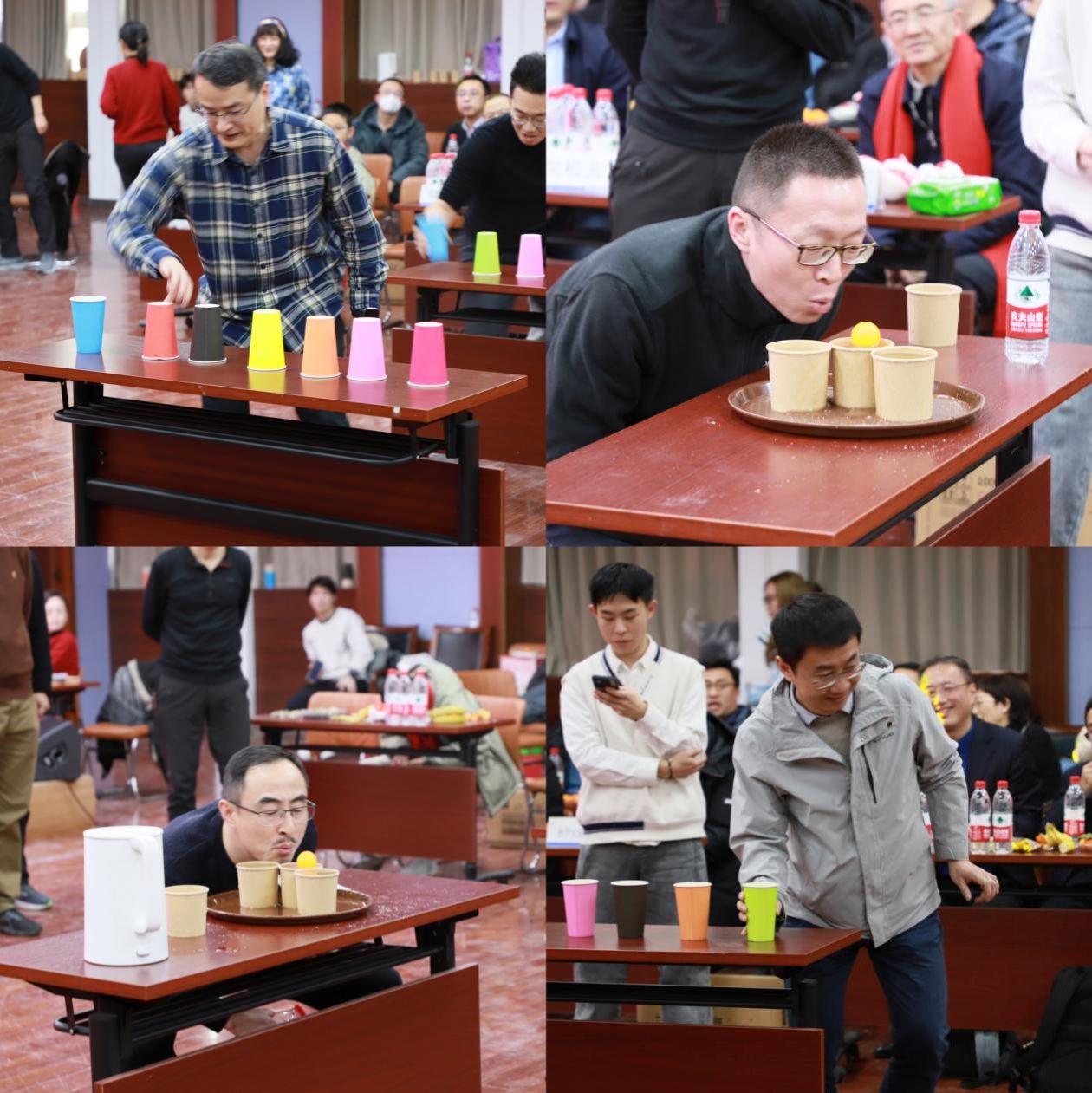 趣味活动环节也为大会增添了不少欢乐的氛围。《单手翻纸杯》和《吹乒乓球过河》两个游戏,不仅考验了各个团队之间的默契度,也让在场的教职工在轻松愉快的氛围中放松了身心。