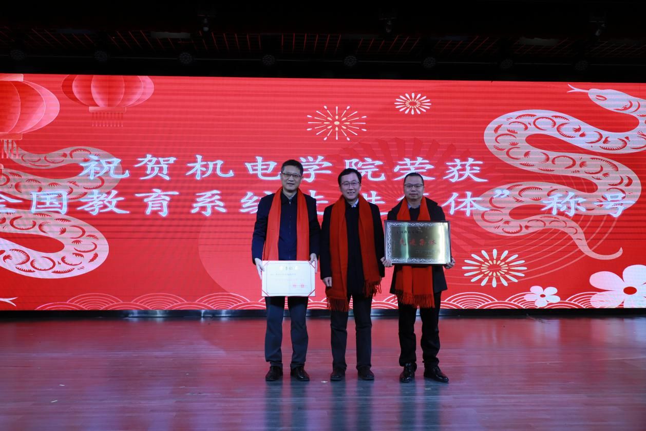 张卫红院士为学院颁发“全国教育系统先进集体”奖状,这一荣誉是对学院过去在各项工作所取得成绩的高度认可,张映锋、常洪龙代表全体教职工上台领奖。