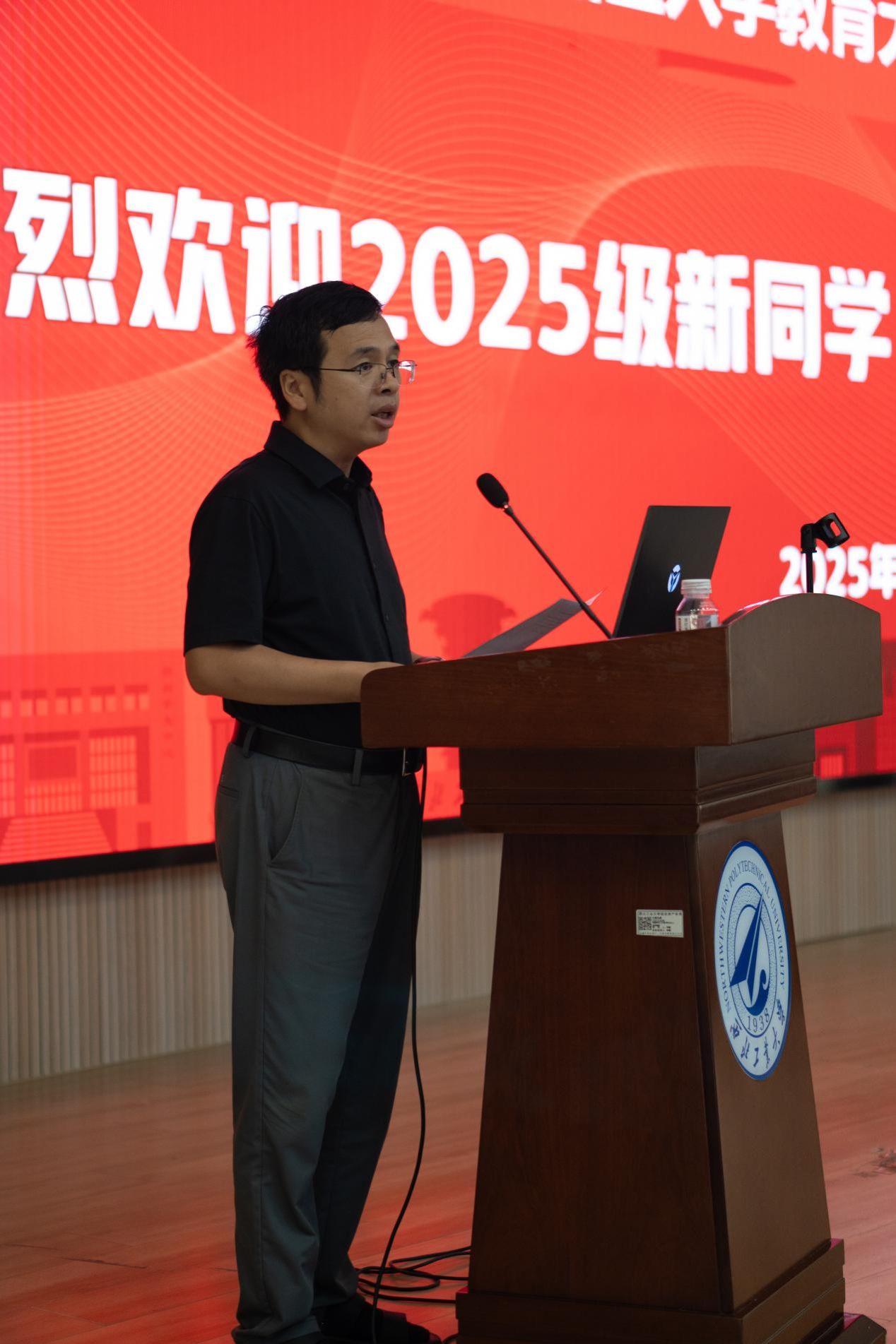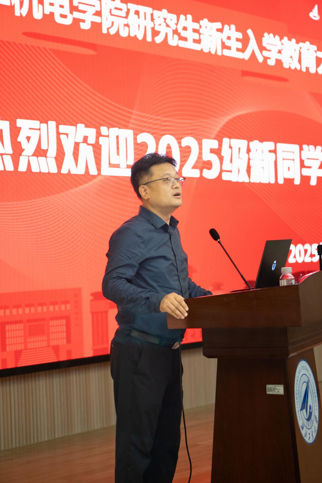 院长常洪龙教授首先代表学院向全体新生致以热烈欢迎,并系统介绍了学院在学科建设、师资队伍和科研成就等方面的雄厚基础与突出成果。他还特别强调了校园安全稳定工作的重要性,提醒同学们牢固树立安全意识,共同维护和谐稳定的学习环境。