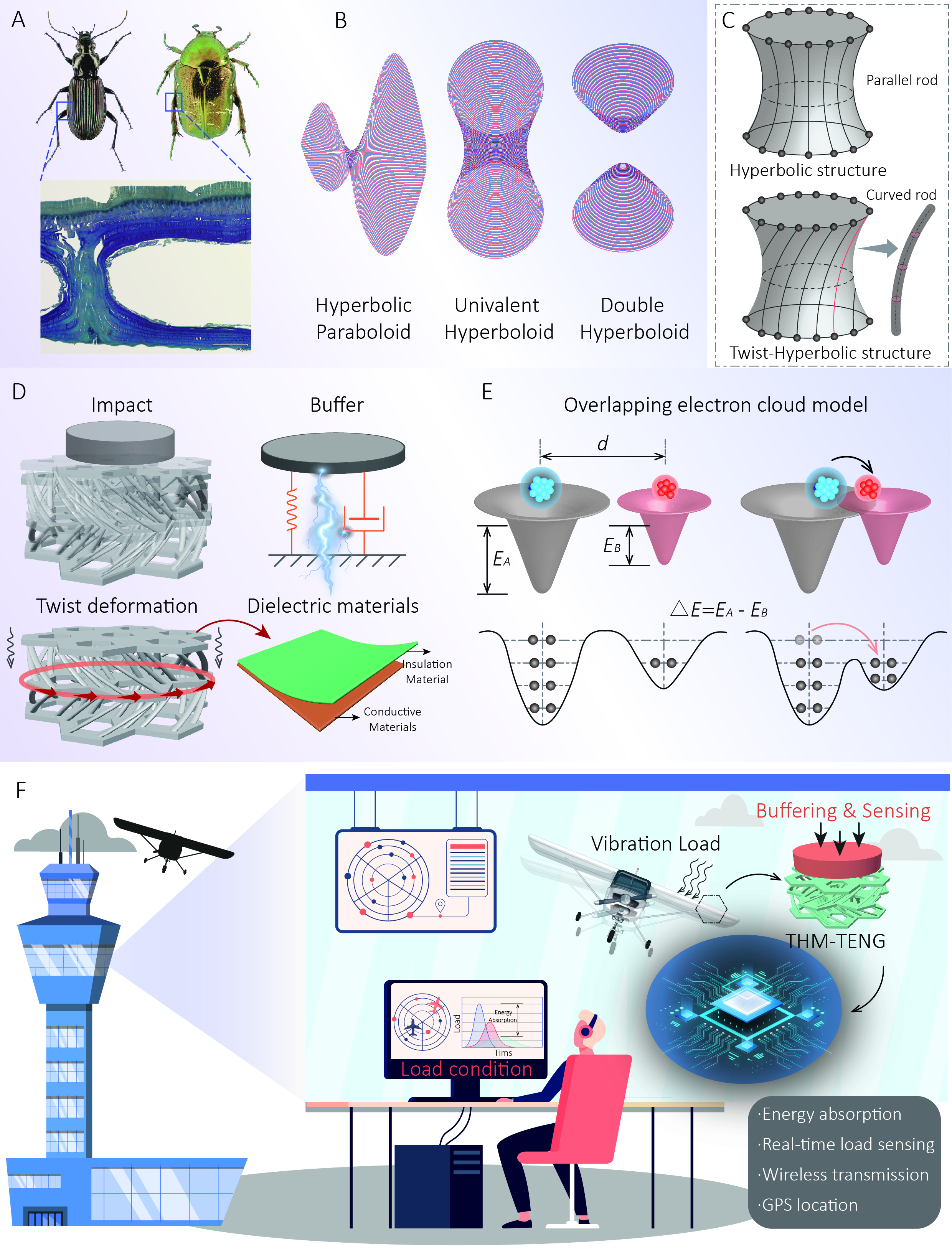 近日,学院齐乐华教授团队在兼顾冲击防护与自供能传感的力学超结构方面的研究取得新进展。相关成果《Bioinspired Twist-Hyperbolic Metamaterial for Impact Buffering and Self-Powered Real-Time Sensing in UAVs》发表在Science 子刊《Science Advances》上。学院晁许江副教授为第一作者,柔电院梁飞副教授、齐乐华教授和中科院王中林教授为通讯作者。