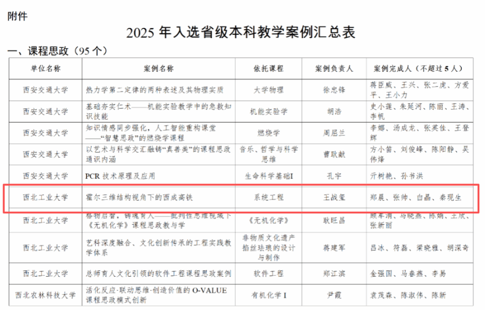 近日,陕西省教育厅公布了2025年省级本科教学案例遴选结果,我院王战玺教授团队依托《系统工程》课程的教学案例-《霍尔三维结构视角下的西成高铁》、王文东教授团队的教学案例-《基于电工学课程的“六位一体”课赛融合教学新模式探索与实践》成功入选省级本科教学案例。