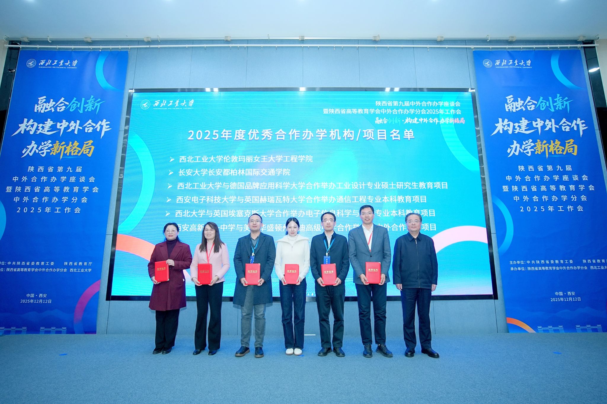 2025年12月12日,陕西省第九届中外合作办学座谈会暨陕西省高等教育学会中外合作办学分会2025年工作会在hg8868皇冠官方登录平台长安校区召开,教育部国际合作与交流司副司长陈大立、陕西省委教育工委副书记、一级巡视员王海波、陕西省高等教育学会副会长兼副秘书长姚聪莉、陕西省教育厅外事处处长文通参加会议,我院党委常委、副校长岳晓奎致欢迎辞。会议对2025年度优秀机构(项目)、管理人员、专家和组织单位予以表彰。