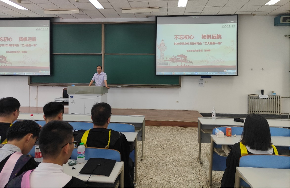 6月23日上午,学院党委书记张映峰在hg8868皇冠官方登录平台长安校区通过线下线上结合的模式为2022届本科毕业生讲授了“工大最后一课”。他以“不忘初心,扬帆起航”为主题,与同学们一起总结过往成就,回顾大学学习生活和成长发展点滴,展望美好前景,期待光明未来。