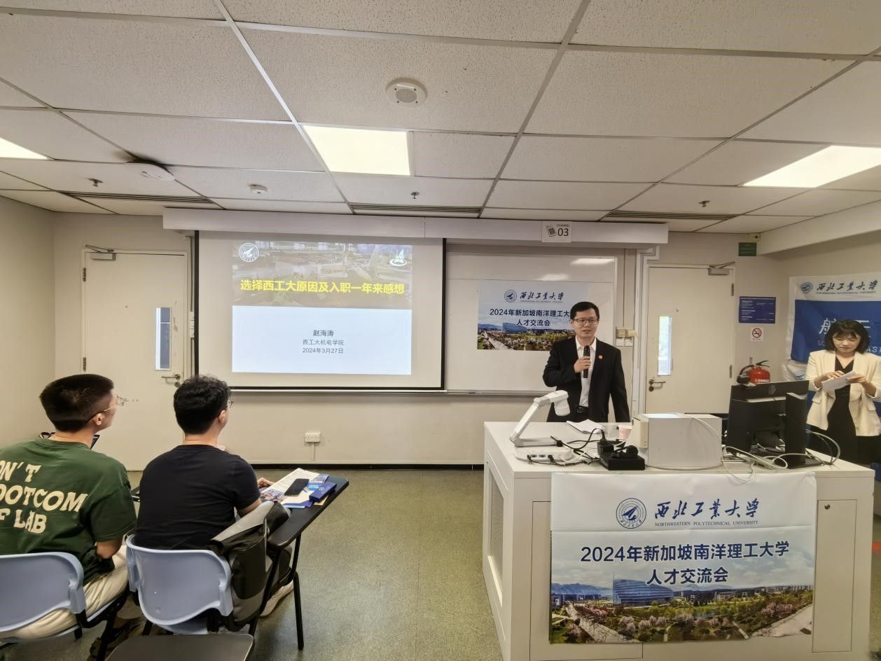 南洋理工大学的人才交流会上,赵海涛作为青年教师代表发言,他向参会青年学者介绍了自己选择学院原因以及入职学院一年以来的感想。他表示,校院两级对于优秀人才的需求和重视程度一致。为了给优秀青年教师提供良好的发展环境和支持,学院在政策、平台、经费等多维度全力支持,专门建设了友谊校区天工开物人才特区以及长安先导航宇制造人才特区,此外学院还额外提供优厚的薪酬待遇和运动场馆福利,诚邀优秀青年学者加入,一起公为天下,报效祖国。