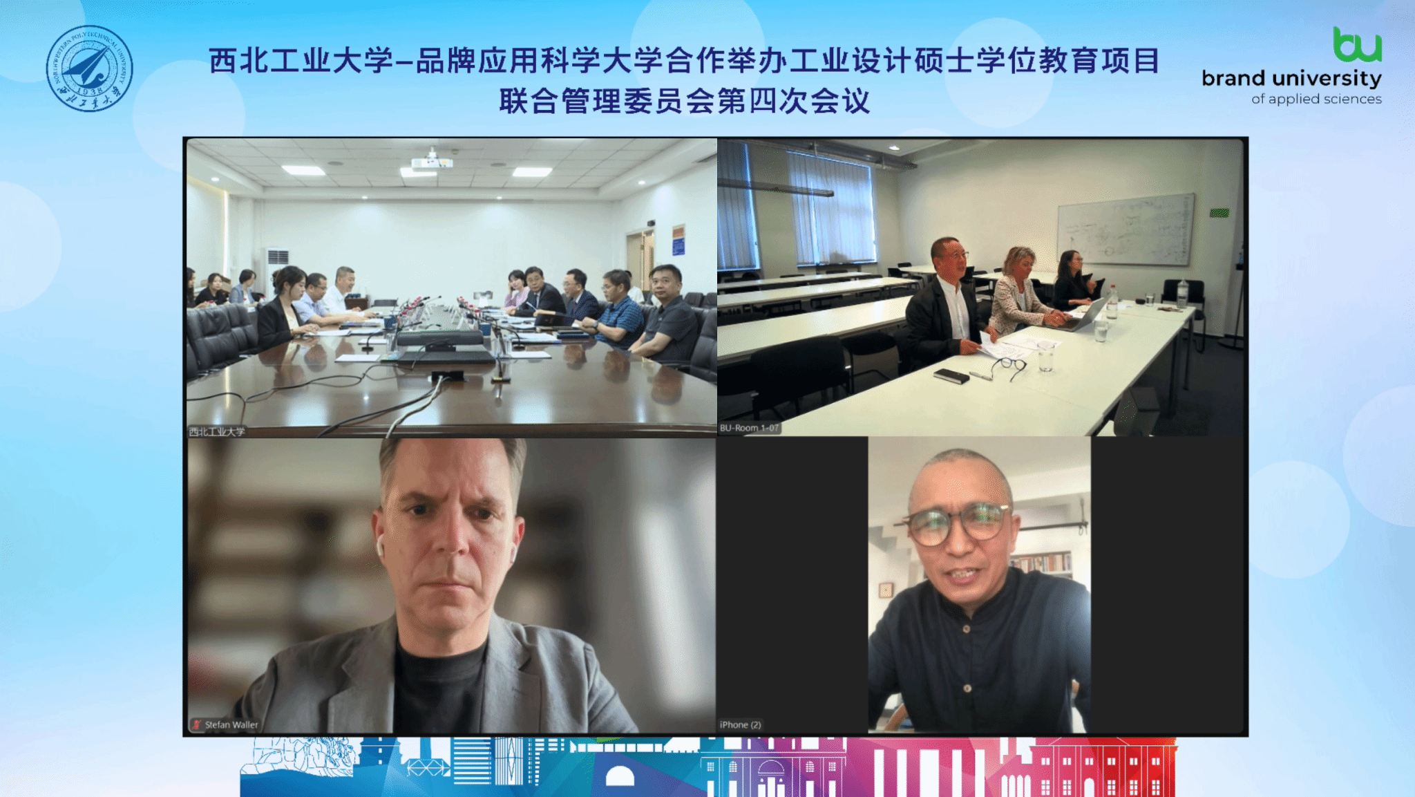 2024年6月12日,我院-德国品牌应用科学大学工业设计硕士学位教育项目联合管理委员会第四次会议在友谊校区顺利召开。hg8868皇冠官方登录平台副校长、中科院院士张卫红,德国品牌应用科学大学校长Shan Fan、行政副校长Maren Bolbrügge等出席会议。本次会议以视频形式召开,会议由张卫红主持。